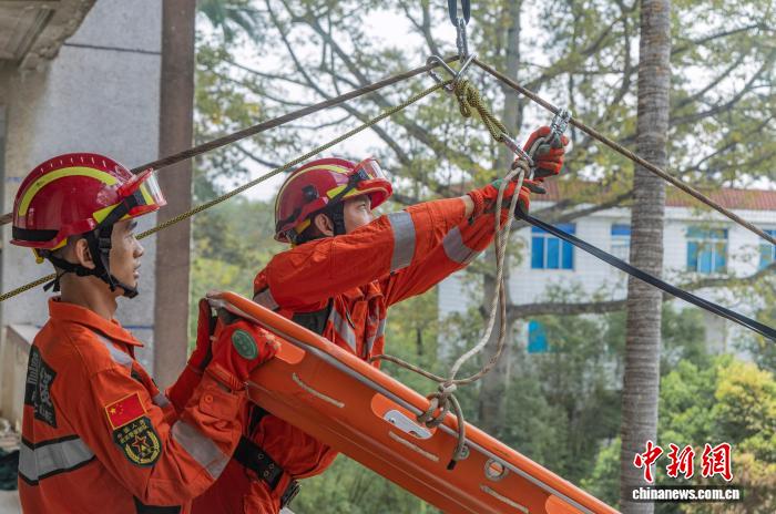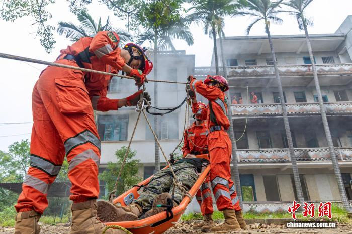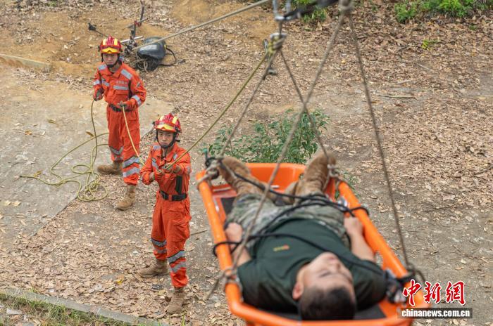 图为武警广西总队灵活收队工卒分队民卒正正在停止绳子救济。何家龙 摄